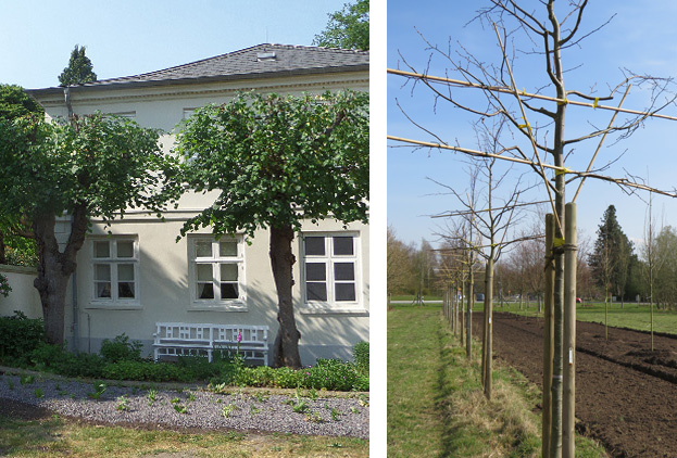 Bei denkmalgeschützten, historisch wertvollen oder anderweitig besonderen Objekten mit alten, besonders gestaltenen Formbäumen ziehen wir diese bei uns im Quartier nach (baumschulmäßig). Wir pflanzen hier die vorher exakt bestimmten Bäume (in Art und Stückzahl) auf, schneiden und formieren diese entsprechend der Kronen der vorhandenen Altbäume (regelmäßig und ggfls. auch über Jahre, bis zum Zeitpunkt X). Nach Rodung der alten Bäume (bei nicht mehr zu vertretenem Erhalt) werden nun die nachkultivierten Bäume in diese Lücken gesetzt (immer nach Bedarf, ggf. in mehreren Schüben) und hier weitergepflegt.