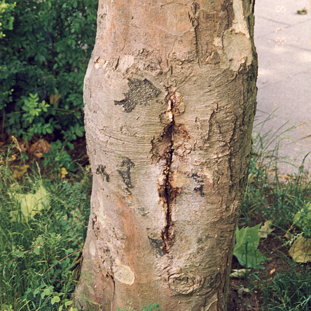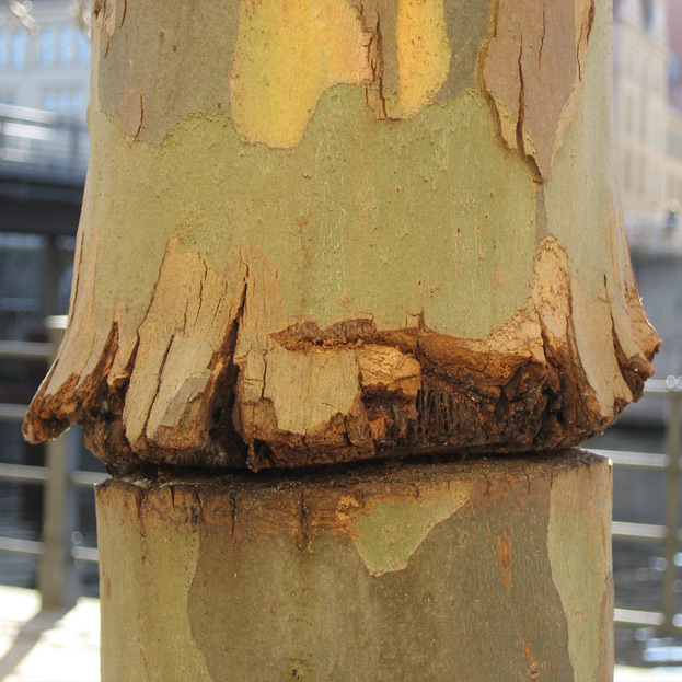 Die nachfolgenden Bilder zeigen eine stark geschädigte Platane, ihre baumpflegerische Behandlung und den Heilungsprozess.