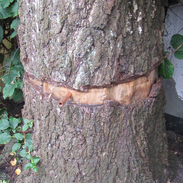 Bei mutwillig beschädigten Bäumen (Baumfrevel), wo infolge von zum Beispiel Ringelungen oder Axthieben der Baum in seinem Bestand gefährdet ist, versuchen wir mit Hilfe von "baumschulischen Kunstgriffen" den Baum zu halten. So ist es uns schon mehrfach gelungen, großflächige, tiefgehende und auch stammumgreifende Wunden mit Hilfe von Bypässen dauerhaft zu sichern. Voraussetzung sind hier neben umfangreichen Kenntnissen auf dem Gebiet der Baumbiologie auch vielfältige praktische Erfahrungen auf dem Sektor der Baumschule und Baumchirurgie.